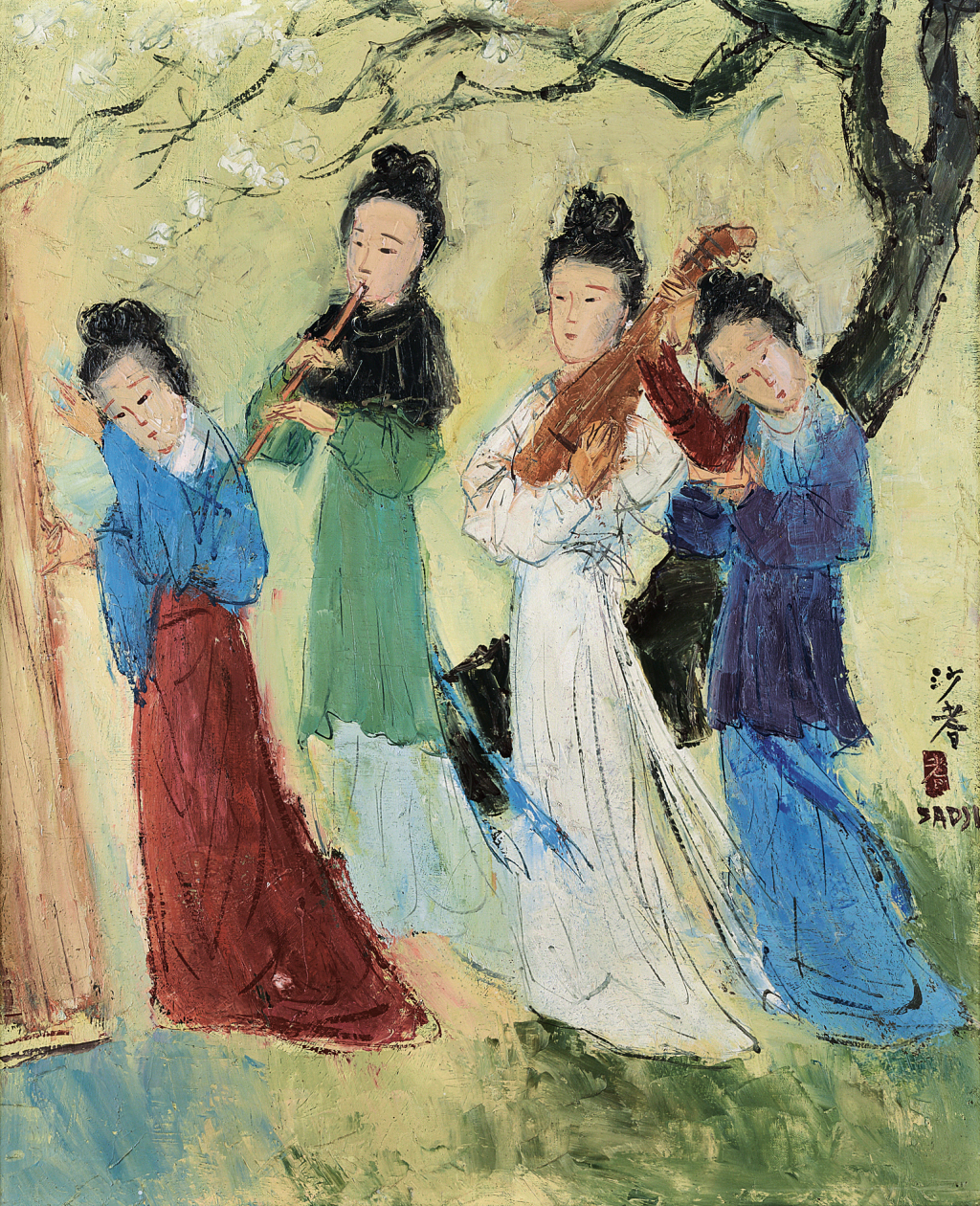 音乐是伊丽莎白王后人生的重要主题,而沙耆以“音乐会”为题,借仕女合奏之景,不仅既现代诠释中国传统题材,也隐喻欧洲战时对和平的呼唤。画面源于中国古代仕女图传统:四位奏乐的宫装仕女立于树荫之下,面容娴雅含蓄,衣着明艳,手持琵琶、笙、萧等中国传统乐器,并随着音乐翩翩舞动。画家运用了散点透视,将空间处理得更加平面,厚重的黄绿油彩交错间,可见强烈的笔触与清晰刀痕,充满质感与动势,是画家当时标志性的技法。通过交替使用精细、粗放的色块,沙耆塑造仕女纤细的形体,丰富的笔触丝毫没有损害色彩的富丽和形体的充实,给人一种亲切自然之感。而枝头的白色梅花、老树东方式的曲折造型、类山水结构的草地、水和山的意象在画家的笔下都显出一种生气,东方特质鲜明。