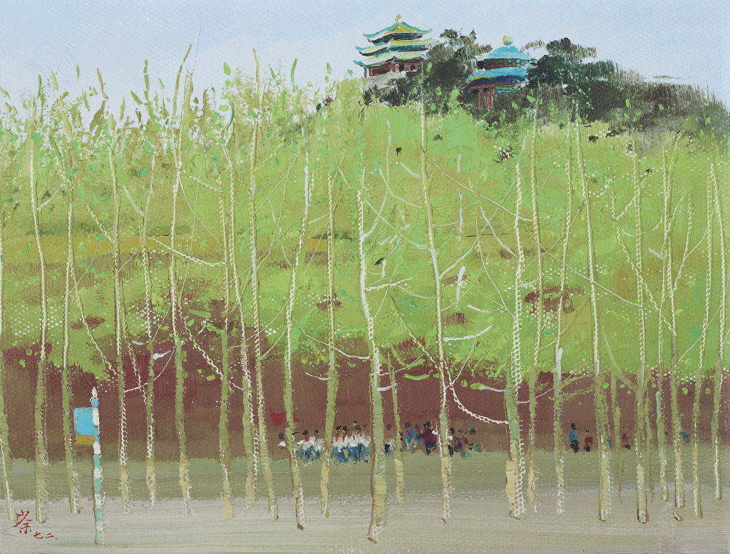画中,挺拔的树木占据视觉中心,嫩绿色的新叶掩映着斑驳的红墙,形成红与绿,古与新,横与纵的对比关系。各色衣着的游人如音符般点缀其间,尤其引人瞩目的是一群穿校服、举着红旗的学生和路旁多彩的公交站牌,带着新世代特有的活力,与高处景山公园的标志性建筑—万春亭和周赏亭,形成大与小,高与低,前与后的反差。画面虽由大块的绿与红构成,但大块大面又都由镶嵌式的小块组合,形成你中有我,我中有你的丰富层次,展现了艺术家在下笔前的悉心经营。