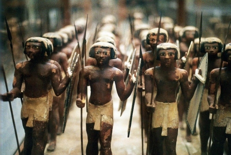 面对埃及琳琅满目的陶器、棺木、小雕像和布满象形文字的器物,观众很容易感到信息过载。但得益于策展上的用心,这些藏品被编排成一组组精心构建的视觉单元,虽然在形式上略显对称,却足够吸引目光。大型透明展柜将邻近的展品层层叠映,形成丰富的视觉关系。其中一个亮点展品,是一组40件微型木制士兵模型,出土自第一中间期(约公元前2181-公元前2055,古王国时期和中王国时期间的大约100年的历史时期)末期一位地方总督梅塞赫提(Mesehti)的墓葬。这类供死者来世守护之用的随葬品,提供了对当时普通社会成员极为难得的观察窗口。士兵们留着整齐的短发,手持长矛与盾牌,身穿方便行动的短裙,与一旁庄严肃穆的黑色石棺形成优雅对照。