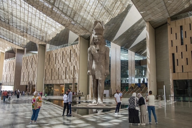 这一场馆的内部空间辽阔得惊人。主中庭大得几乎要“吞没”它的核心展品——拉美西斯二世的雕像。这尊雕像距今已有3200年,高达11米、重达83吨,于1820年在古孟斐斯附近以碎片状态被发现。能有这样的视觉反差,本身就揭示了一座当代“神庙”在展示古代纪念碑时所面临的两难:这些文物本是为了压倒周围环境而设计的——它们的确也曾在数个世纪中达成了这一目的,这种压倒性的感受在博物馆展示中不应被削弱。