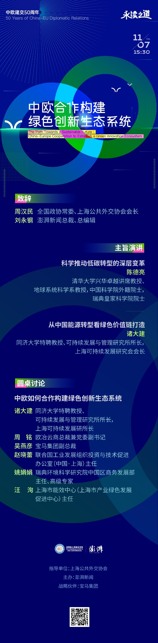 当下,中欧合作构建的绿色创新生态系统,正是指向可持续发展之路的重要坐标。为明确当下共同面对的气候挑战,回顾过往合作历程并总结经验,进而思考拓展各方共赢的更大空间,2025年11月7日15:30,作为2025进博会上海会议活动之一,由上海公共外交协会指导、澎湃新闻主办的“永续之道:中欧合作构建绿色创新生态系统”讨论会,将在上海虹桥绿地铂瑞酒店2层举办。活动还得到了宝马集团的战略支持。