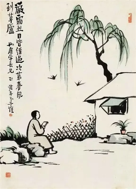 这株杨柳一度成为丰子恺绘画的主题,以至于散文家、诗人俞平伯赠他一个“丰柳燕”的称号。但丰子恺后来表示,他为此树作画并不是刻意的,而是搬到白马湖后有人送了他一株小柳苗,随着这株树苗的长大,他常常为杨柳写生,不自觉地在画中多画杨柳。子恺后来戏称,如果当时种下的不是杨柳而是荆棘,他很可能会把这处房子称作“小荆棘屋”,或许会因为专画荆棘而出名也未可知。丰子恺对非要将他最初与杨柳的结缘归因于古典诗词对杨柳无限赞扬的解读表示十分不屑。他当然知晓古文中常将杨柳比作美人,也知道清初文人张潮就认为柳是天地间感人最深的四物之一——“物之能感人者,在天莫如月,在乐莫如琴,在动物莫如鹃,在植物莫如柳”。苗条的女性常被称作“柳腰”,黄莺和夏蝉都最喜栖息于柳荫之中,微风轻拂柳枝掀起“柳浪”,西湖十景中便有一处名胜是“柳浪闻莺”。另外,人们还可以说,丰子恺钟爱柳树的原因是他喜欢的诗人陶渊明也在住所旁种了五株柳树,并在自传中自号“五柳先生”,此文也是古文中的名篇。