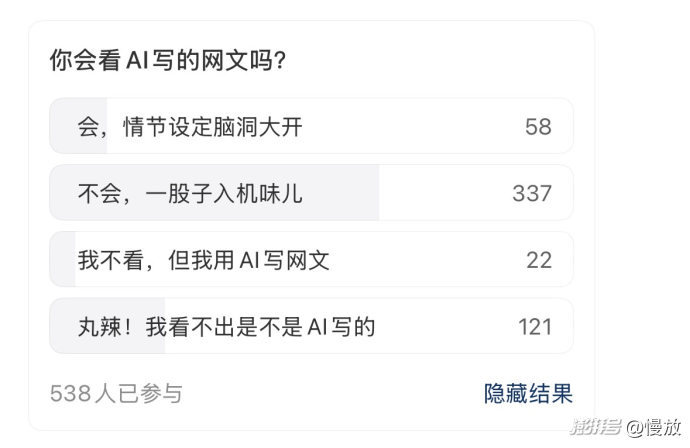 有意思的是,也有读者表示不是不能接受。在337人投票“不看AI网文之外”,另一个略微妙的数据是:有121人表示,自己“分不清AI网文”。